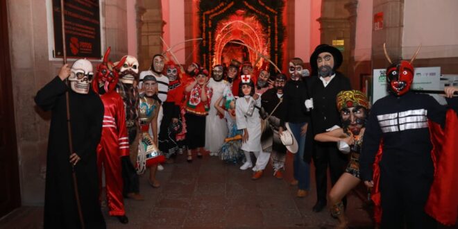 El Palacio de Gobierno se llenó de luz, color y fragancias, con la participación de comparsas tradicionales de la Huasteca y el altar que muestra siete niveles del viaje del alma, representando la travesía espiritual, incluyendo elementos como el agua, la sal, las velas y veladoras, el copal e incienso, las flores de cempasúchil y las calaveras, frutas, pan de muerto, papel picado y fotografías.